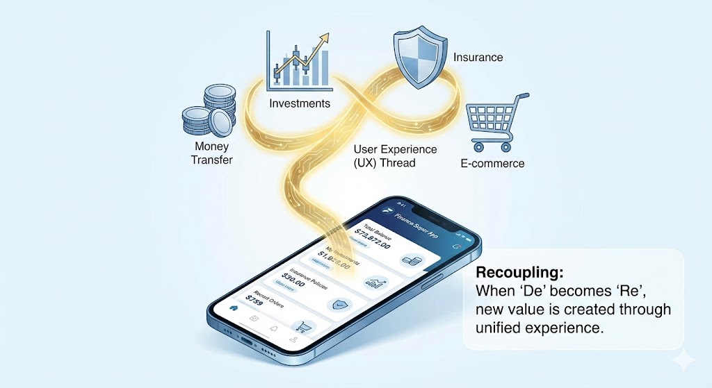 최근의 토스, 카카오페이 등과 같은 금융 슈퍼앱은 흥미로운 리커플링 사례이다. 과거 고객이 송금, 증권, 보험으로 파편화한 금융 서비스를 이용하기 위해 각기 다른 앱을 전전했다면, 이 슈퍼앱은 디커플링된 금융 서비스들을 사용자 경험이라는 하나의 줄기로 다시 엮어냈다. 고객은 이제 하나의 접점에서 모든 금융 욕구를 해결하며, 하나의 문맥 안에서 리커플링을 만나 그 가치를 누린다.